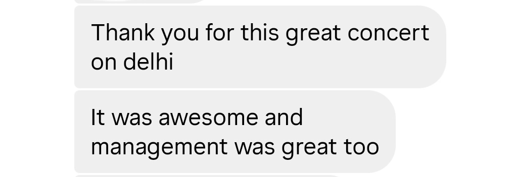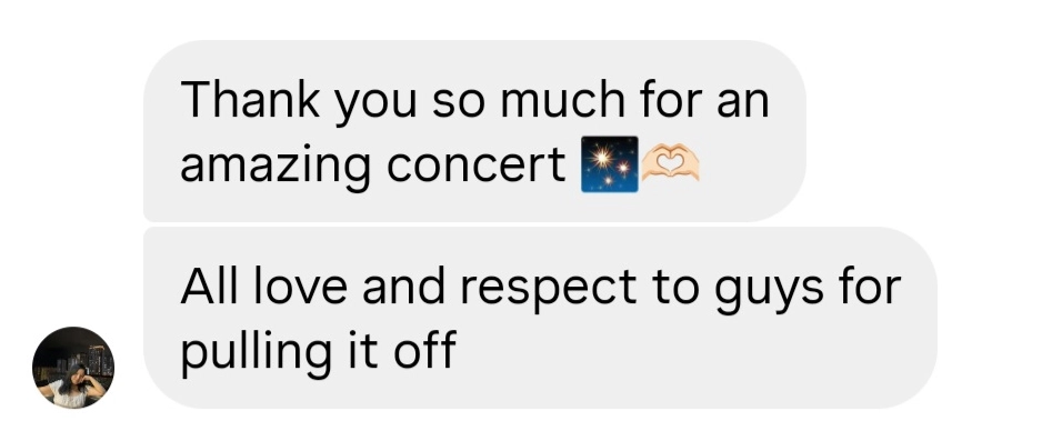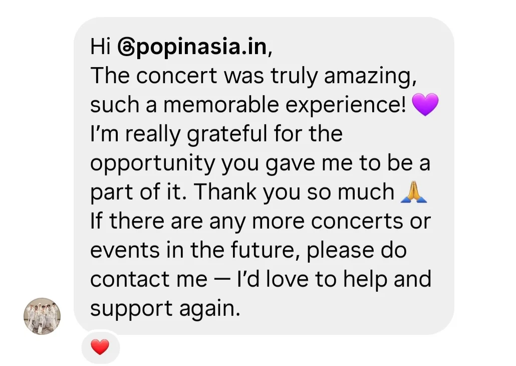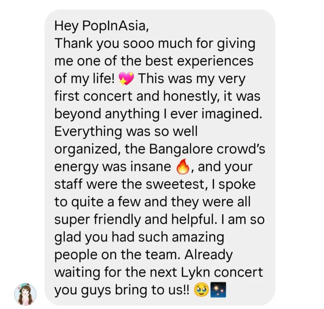 “Hey PopInAsia, Thank you sooo much for giving me one of the best experiences of my life! This was my very first concert and honestly, it was beyond anything I ever imagined. Everything was so well organized, the Bangalore crowd's energy was insane, and your staff were the sweetest, I spoke to quite a few and they were all super friendly and helpful. I am so glad you had such amazing people on the team. Already waiting for the next Lykn concert you guys bring to us!!”