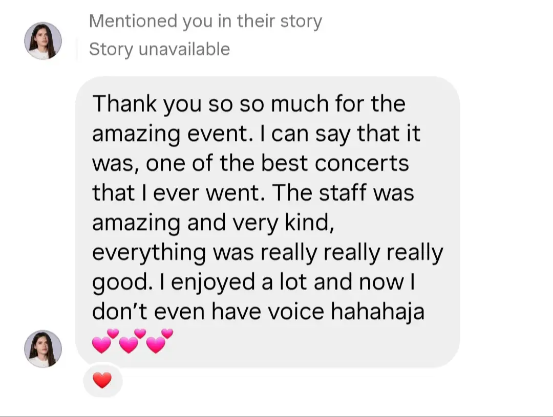 “Thank you so so much for the amazing event. I can say that it was, one of the best concerts that I ever went. The staff was amazing and very kind, everything was really really really good. I enjoyed a lot and now I don't even have voice hahahaja”
